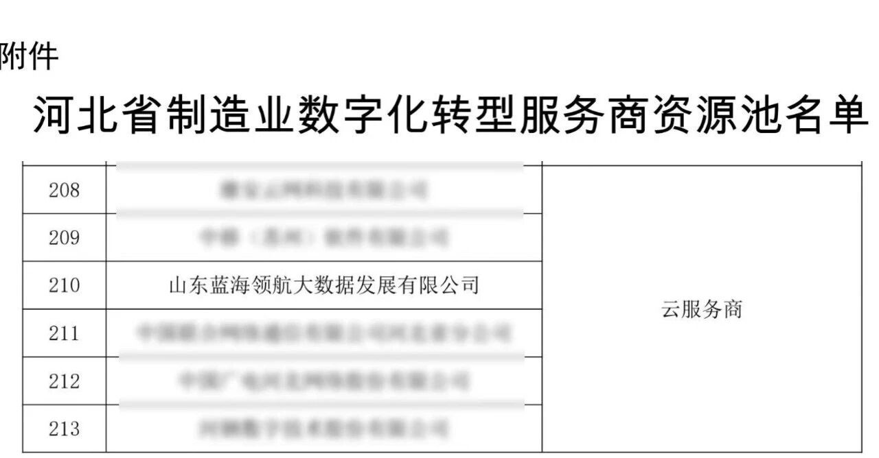 近日,河北省工业和信息化厅公示了省级制造业数字化转型服务商资源池,山东蓝海领航大数据发展有限公司成功入选河北省云服务商。